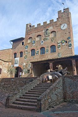 Imposant erhebt sich Palazzo Pretorio im höchstgelegenen und ältesten Teil des Orts dort, wo die Via Boccaccio die älteste Straße des Orts kreuzt. Einst war Certaldos heutige reizende kleine Altstadt, die Heimat des Dichters Boccaccio, nämlich ein Dorf, das mitten in der Toskana oberhalb des Elsa-Tals auf einem Hügel thronte. Wer weiß, vielleicht genau deshalb konnte dieser pittoreske historische Teil der heutigen Kleinstadt seine ursprüngliche Gestalt und seinen Charme bis heute bewahren: Alles, was in Certaldo neu gebaut wurde, steht, bestimmt weil es bequemer schien, unten im Tal. Oben auf dem Hügel ist alles so geblieben, wie man sich einen typisch toskanischen Ort von einst vorstellt: Mächtige Befestigungsmauern, die Halt und Schutz bieten, Häuser aus Bruch- und Backstein mit unzähligen Blumentöpfen vor den Türen, verborgene Ecken, Winkel und Höfe, eine Reihe schmaler Gassen, enger Gänge und Treppen und die Hauptstraße, die zum Palazzo Pretorio führt und in der die wohnten, die Rang und Namen hatten.